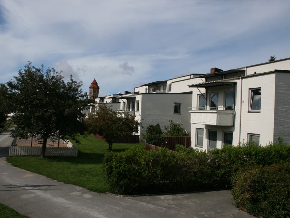 Vita flerfamiljshus på två och tre våningar.